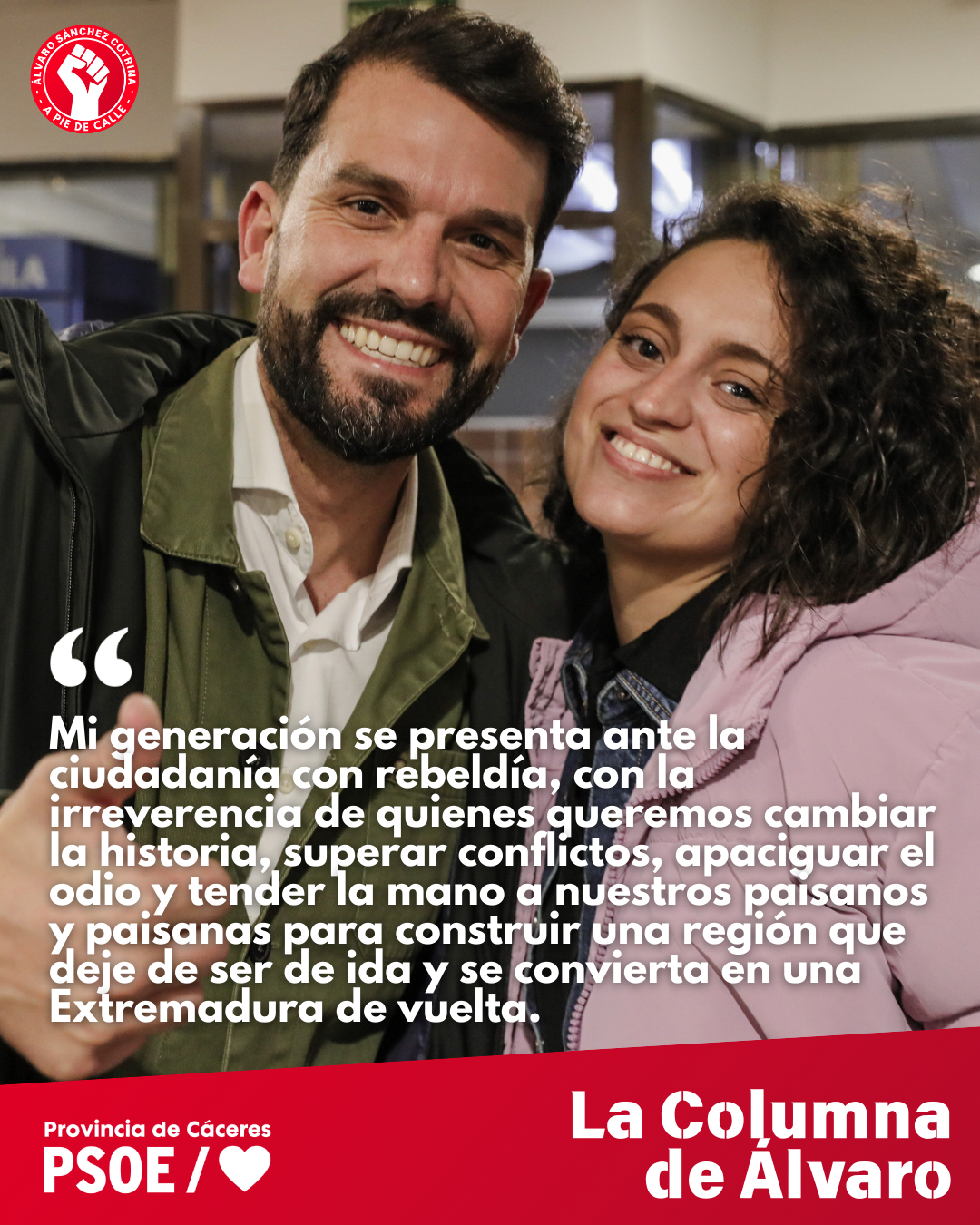 Mi generación se presenta ante la ciudadanía con rebeldía, con la irreverencia de quienes queremos cambiar la historia, superar conflictos, apaciguar el odio y tender la mano a nuestros paisanos y paisanas para construir una región que deje de ser de ida y se convierta en una Extremadura de vuelta. Eso es, torcer la curva demográfica y crecer juntas y juntos para nunca más tener que irnos de aquí si aquí queremos hacer nuestra vida.