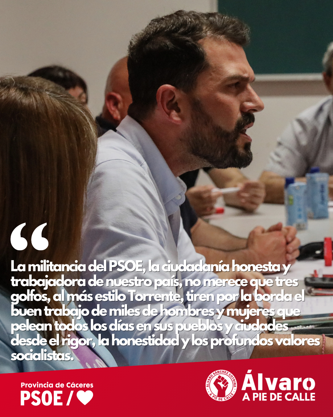 La militancia del PSOE, la ciudadanía honesta y trabajadora de nuestro país, no merece que tres golfos, al más estilo Torrente, tiren por la borda el buen trabajo de miles de hombres y mujeres que pelean todos los días en sus pueblos y ciudades desde el rigor, la honestidad y los profundos valores socialistas.