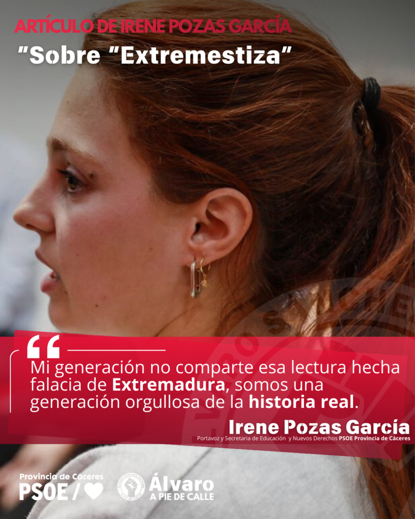 Por eso mi generación, esta generación que no comparte esa lectura hecha falacia de Extremadura, somos una generación orgullosa de la historia real. Yo, que como muchas y muchos me siento tan orgullosa de ser extremeña que a veces ese orgullo no me cabe en el pecho, orgullosa de la gente que peleó para que esto no siguiera siendo una tierra feudal, para que fuera de todas y todos.