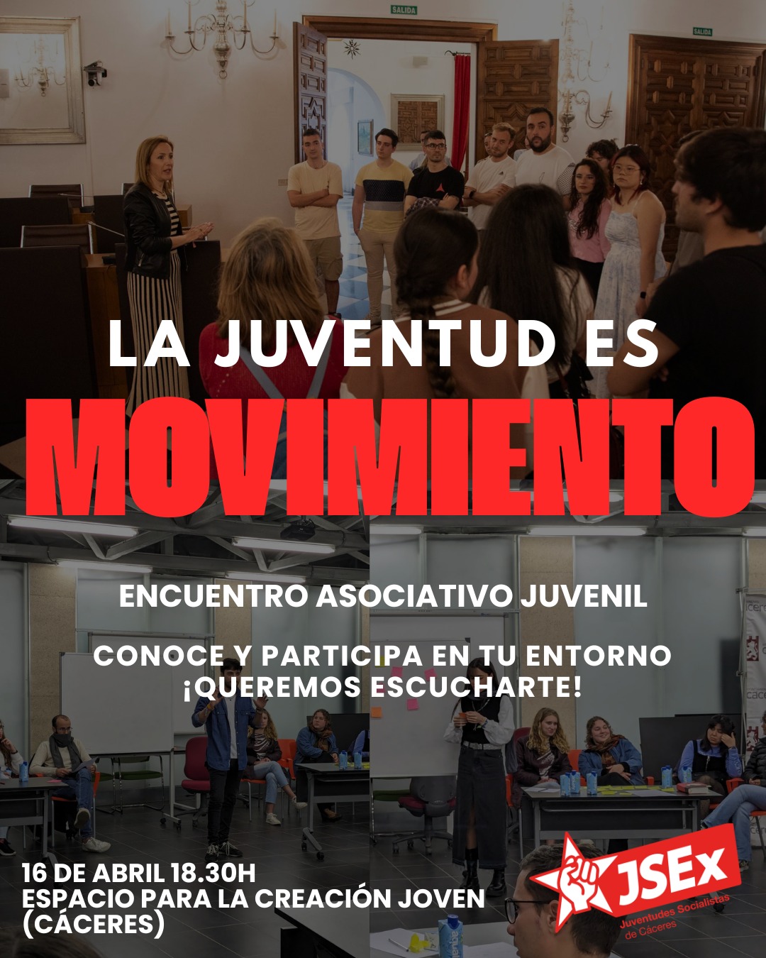 Las Juventudes Socialistas de Cáceres organizan este jueves, 16 de abril, una jornada de encuentro y debate bajo el lema “La juventud es movimiento”, con la que buscan reafirmar su compromiso con la movilización social y el papel transformador de la juventud.