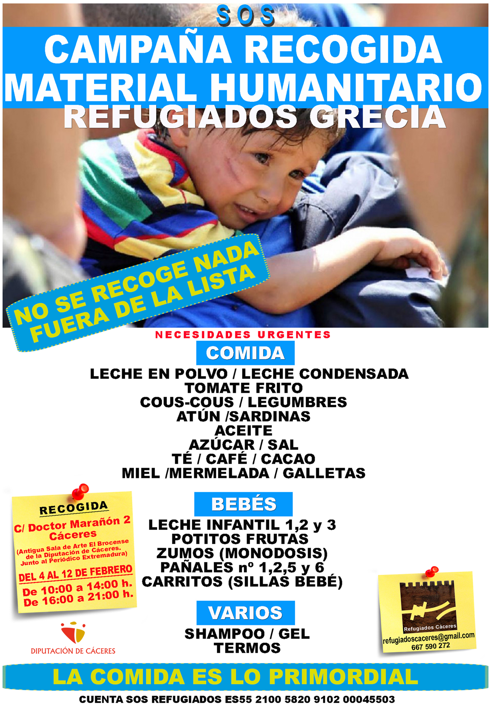 Además, se pone a disposición la cuenta de S.O.S. Refugiados (ES55 2100 5820 9102 00045503) para toda aquella personas que desee hacer una donación económica.