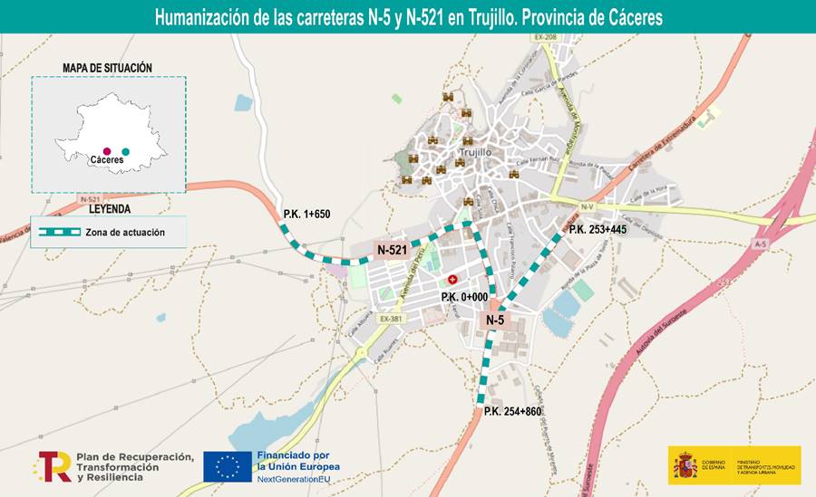 - Los tramos contemplados se sitúan en las carreteras N-5, entre los km 253,4 y 254,8; y la N-521, desde su inicio al km 1,6.