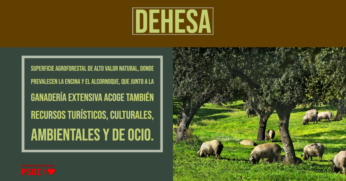 La dehesa tiene una importancia ecológica, económica y sociocultural de tan alto valor en Extremadura, que requiere de una mayor visibilidad y presencia para afianzar compromisos concretos de los organismos del Estado y de la Unión Europea, pues es responsabilidad de las instituciones velar por la gestión de los recursos medioambientales garantizando su conservación, la recuperación y puesta en valor de las potencialidades que atesora su patrimonio natural y el aprovechamiento sostenible asociado a éste. En el mismo sentido es esencial favorecer y fomentar la viabilidad de las explotaciones agroganaderas, la conservación de la biodiversidad y la provisión de servicios ambientales públicos, así como otras actividades económicas compatibles para garantizar su supervivencia, recuperación y puesta en valor. Desde la Consejería de Agricultura, Desarrollo Rural, Población y Territorio de la Junta de Extremadura, se lleva años trabajando muy duro por conseguir esos objetivos, por colocar a nuestra dehesa en el lugar que le corresponde, con planes, estrategias, líneas de ayudas, política forestal, agrícola y ganadera, grupos operativos de investigación, desarrollo e innovación.