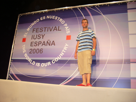 The world is our country... Voluntario cacereño con el lema del festival